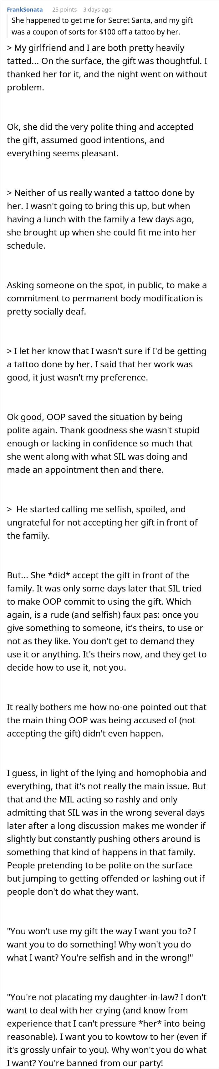 This is exactly why one woman refused to get tattooed by her future sister-in-law, who gave her a $100-off voucher as a Secret Santa gift. Unfortunately, the other lady didn’t take the rejection too well and tried to pit her family against the baffled poster.