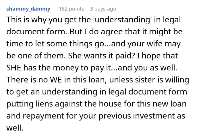 “We poured enough of our own money into that pit and refused her request,” John says. This sparked another round of arguments between him and his wife, escalating to the kind of shouting matches you’d expect to see on a reality TV show. John admits he might be a tad petty, but believes he is justified. After all, they’ve already lost $75,000 to her. His wife, on the other hand, can’t stand the thought of her sister losing their childhood home.