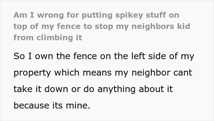 So one day, they reached a breaking point and installed sharp, spiked deterrents along the top of the fence. The mother saw it and questioned the move, calling it extreme. However, the OP responded bluntly and essentially told her that if her son stopped climbing the fence, he wouldn’t get hurt.