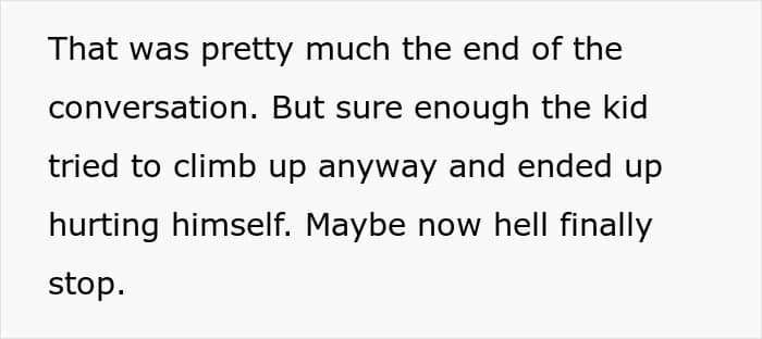 Despite the warning, the son attempted to climb the fence again and injured himself. As much as the OP understood he was just a child, they couldn’t but note that the boy’s spying had been very annoying and deeply uncomfortable.