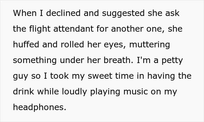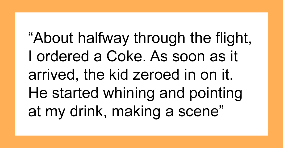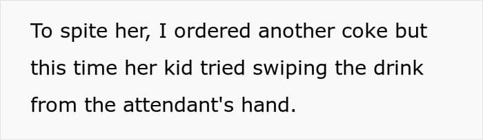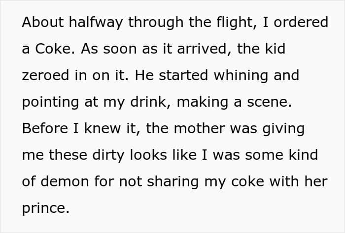 Guy ordered another Coke, but obnoxious kid tried to swipe it from flight attendant’s hand, which got him and the mother instantly scolded