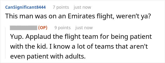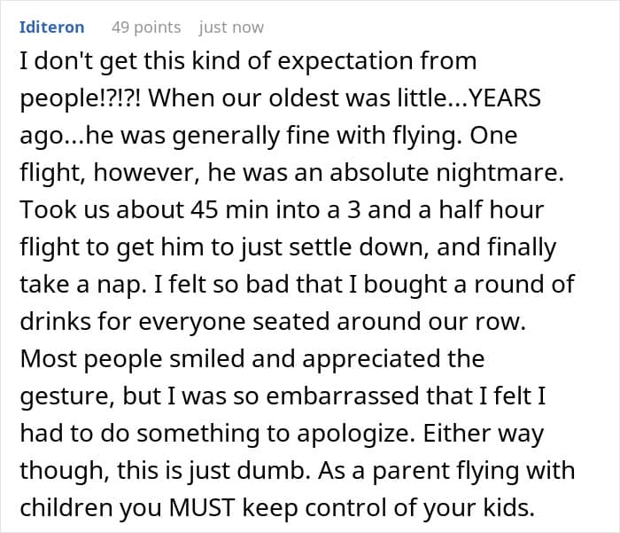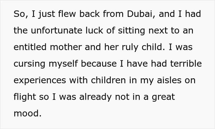 The man, who’d just got back from a long flight, told the community that, when he realized who he’d been seated next to, he cursed his bad luck. He’d had bad experiences with parents and kids on some of his previous travels, so he knew he was in for a long flight.