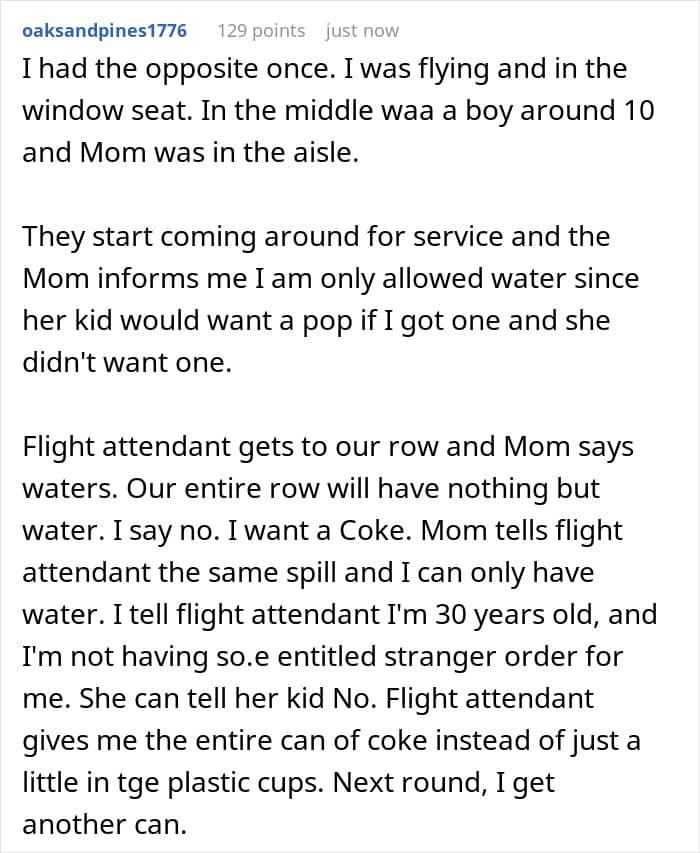 To up the ante, the guy then ordered another Coke, but this time the unruly kid tried to grab it right out of the flight attendant’s hand. That was the straw that broke the camel’s back, because the attendant immediately gave the mother a quiet, but stern, talking to.