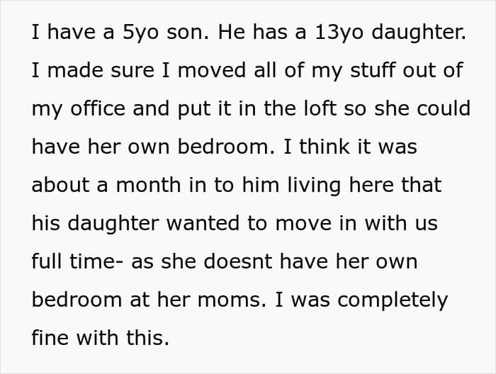 The OP shared that her boyfriend of three years moved into her home few months ago. While she had a 5-year-old, her boyfriend had a 13-year-old who eventually moved in with them full time. The OP had graciously rearranged her home to make room for the teen, moving her own office to the loft so her boyfriend’s daughter could have her own bedroom.