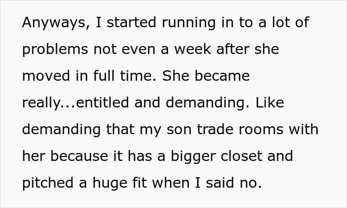 However, within less than a week of moving in, problems started surfacing. The OP noted that her boyfriend’s daughter started demanding that her son trade rooms with her because he had a bigger closet, expecting expensive clothes and makeup just because the OP was a real estate agent, and refusing basic chores.
