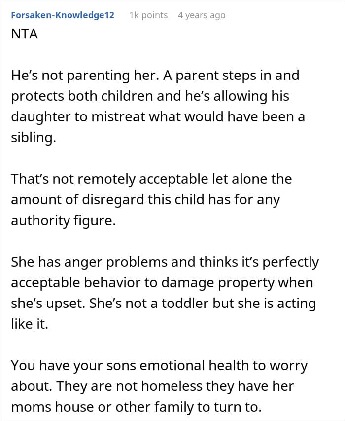 It all soon escalated to her slamming doors, tormenting the OP’s son, and even putting holes in walls. The boyfriend, rather than enforcing rules, excused the behavior, saying that she would “grow out of it”. In fact, every time she tried to correct the daughter, her boyfriend would say she was being too harsh.