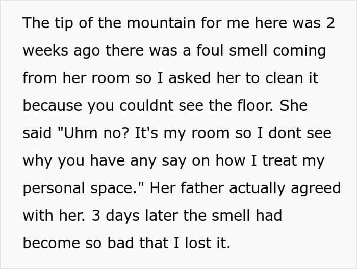 The tipping point came when the teen refused to clean her room, which had become filthy and smelly, with moldy cups and used menstrual products scattered around. The OP gave repeated warnings and even involved the boyfriend, who still defended his daughter. When no change occurred, she had an eviction notice drawn up, demanding that both her boyfriend and his daughter leave the home within 30 days.