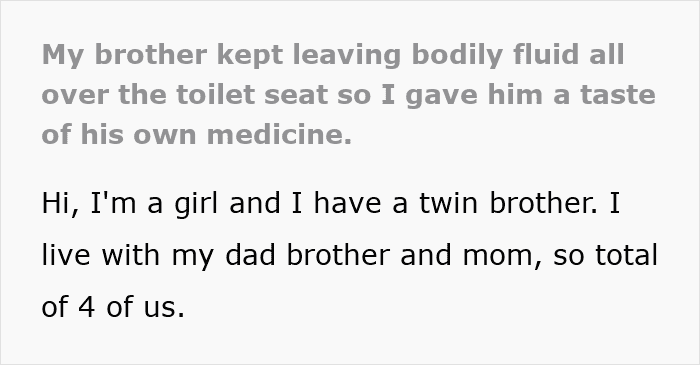 The OP shared that her family consisted of her mom, dad, and her twin brother. She also noted that they shared the same bathroom and noticed that every single morning, the toilet seat was splattered with urine, a sight that went from annoying to infuriating. Already knowing it was her brother, she would report him to their dad who would scold him in turn.
