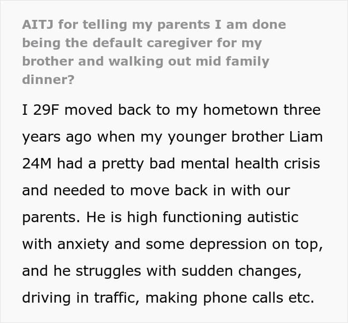 When the original poster (OP) moved back to her hometown, she imagined helping her autistic younger brother “for a little while.” Instead, she became his full-time crisis manager, chauffeur, emotional anchor, and general fixer of anything life threw at him. Her parents, overwhelmed, unsure, and in their sixties, leaned on her for every emergency, big, small, and sometimes barely real.