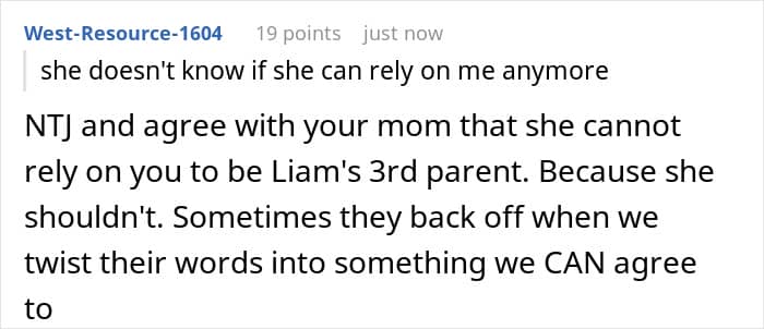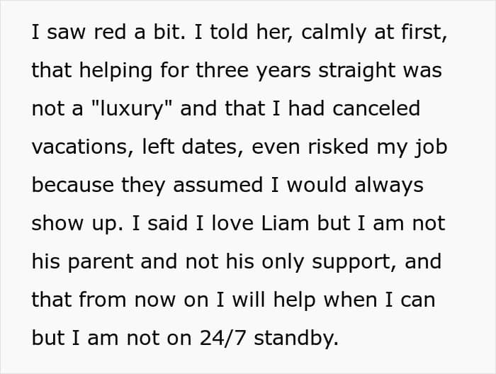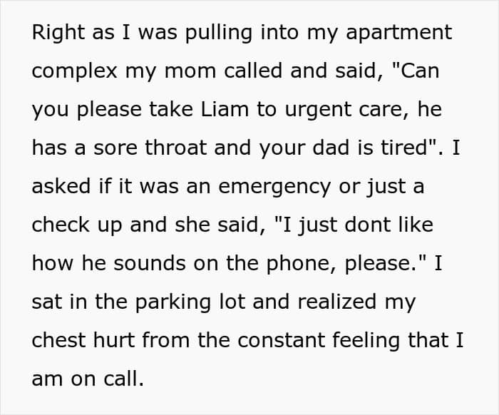 Three years later, OP was burning out fast. Balancing a full-time job, online classes, and a relationship, all while being on 24/7 standby left her exhausted. The breaking point came when her mom asked her to take her brother to urgent care for a sore throat… on a day when she could barely drag herself home. For OP, saying no wasn’t rebellion, it was a survival tactic.