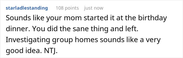 Her parents, however, didn’t see it that way. They grew cold, relatives chimed in with guilt trips, and a tense family dinner reached boiling point when her mom openly implied she was selfish. For the first time ever, OP firmly said she couldn’t be the only adult stepping up, and that setting boundaries wasn’t a luxury, it was long overdue self-preservation. Then she got up and walked out before dessert even hit the table.