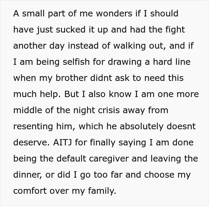Leaving the dinner sparked drama, silence, and even more accusations, but her brother quietly supported her. Now she’s left wondering if finally protecting her mental health makes her the villain, or if this was simply the moment she stopped drowning to keep everyone else’s heads above water.