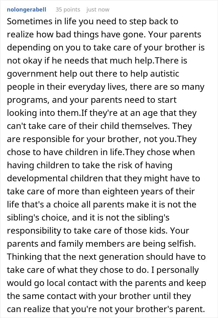 One woman turned to an online community to vent after she spent the last three years bending over backwards to take care of her autistic brother while her folks didn’t lift a finger. When she put her foot down, though, things went south fast.