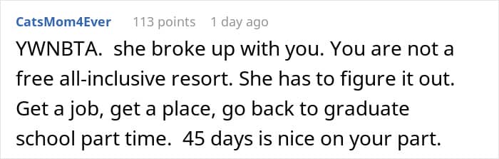 People sided with the man and told him only to give his ex 30 days to leave, since she clearly seemed to be a mooch