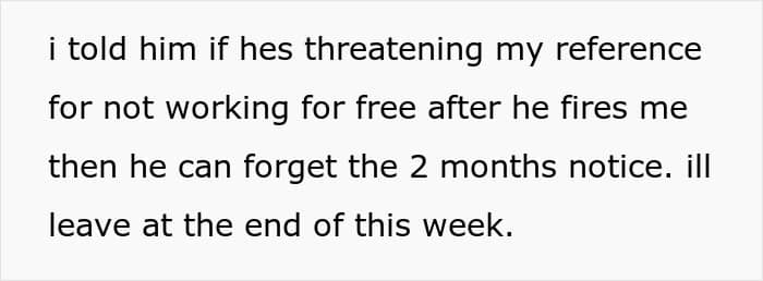 When she refused to work for free, her manager threatened to not give her a good reference, but then, she insisted on leaving in a week instead of 2 months