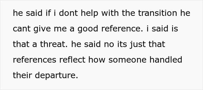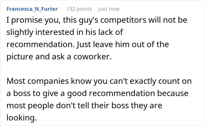 Basically, he is sabotaging the company’s reputation by having a toxic working environment. Apoorva noted that not only is it unprofessional, but this behavior is also ethically appalling. “It’s a huge misuse of managerial power that shows a lack of integrity,” she concluded. Well, it definitely sounds like the boss was on a power trip, trying to exploit the poster.
