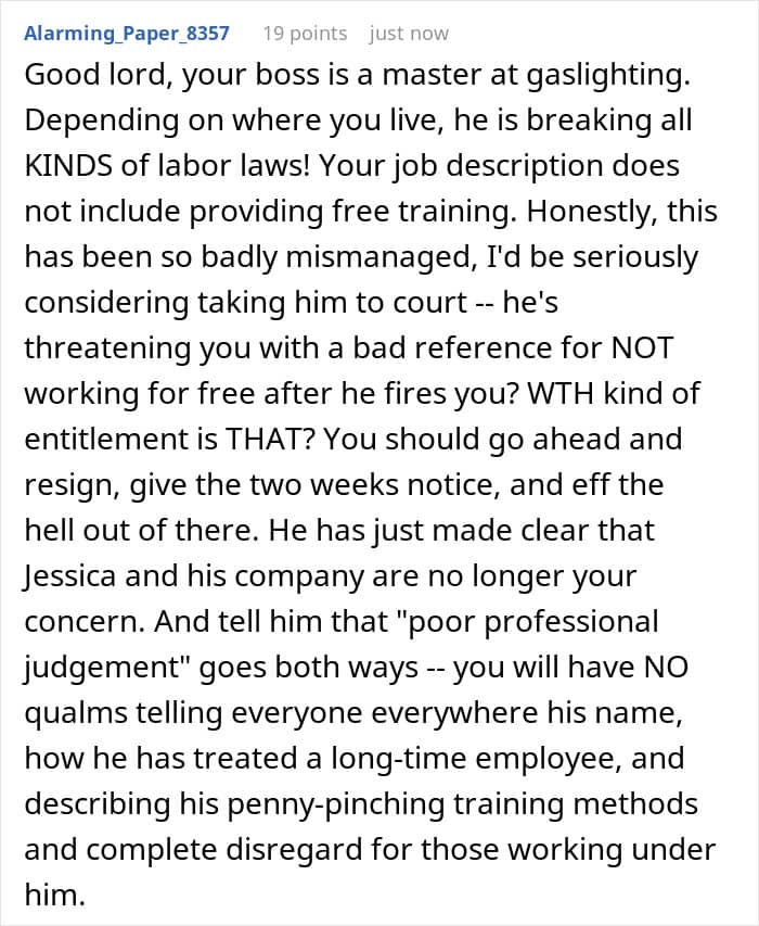 Now, the poster got an email from the new hire (Jessica), asking her about the training. Well, OP’s coworker said that it’s not the woman’s fault, so she should just do it, but her roommate pointed out that she shouldn’t do it for free. Meanwhile, her boss said that it would show her poor professional judgement if she didn’t. This left the poster super confused, so she vented online.