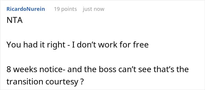 The twist is that her last day is in two months, but after that, the manager expects her to wait another two months, just to train the replacement employee. When she inquired about the salary during that time, he expected her to “be a team player” and do it for free. Obviously, this annoyed her, and she straightaway refused to do free labor, but the man got triggered.