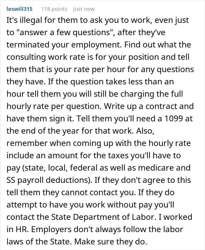 However, the poster’s friends advised her not to work for free since she was fired, but this just confused her about what she should do
