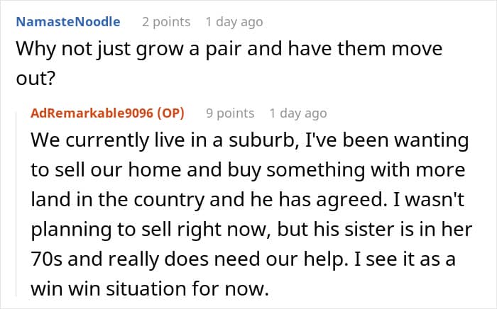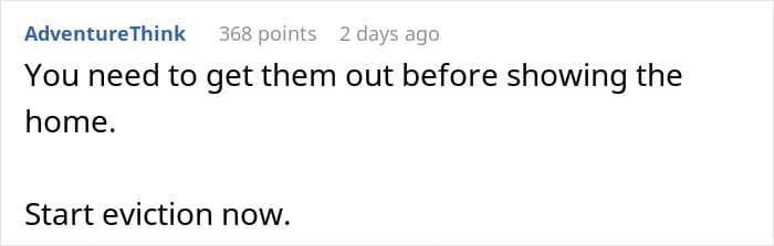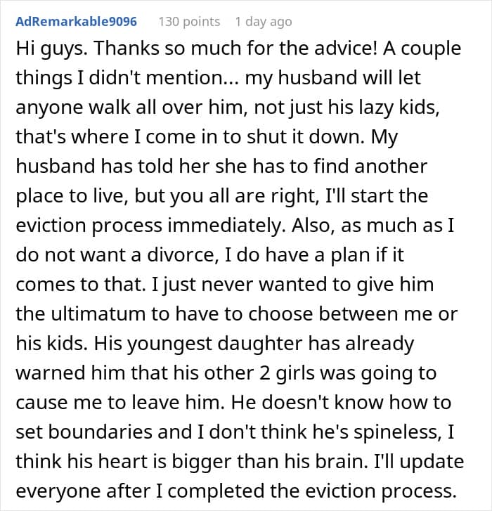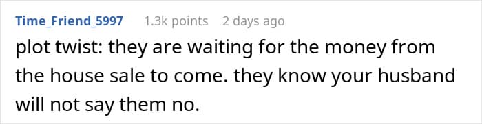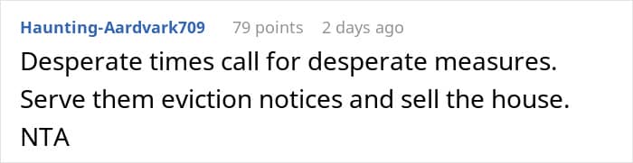 Most commenters are confident that the idea to sell the house seems entirely justified, but the author should’ve kept the sale a secret until the last minute – otherwise, the husband’s daughters will want a share of the money, and he might simply refuse to say no. “Start eviction now,” one of the responders wrote. So what’s your opinion on this case? Please feel free to share your thoughts in the comments.