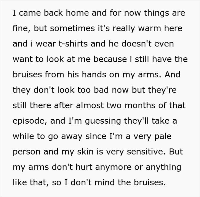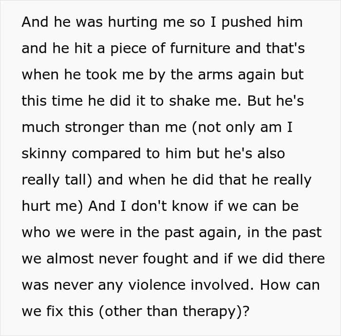 The husband was extremely apologetic about not believing his wife and felt guilty that he had left her with bruises, which is why they started going to therapy