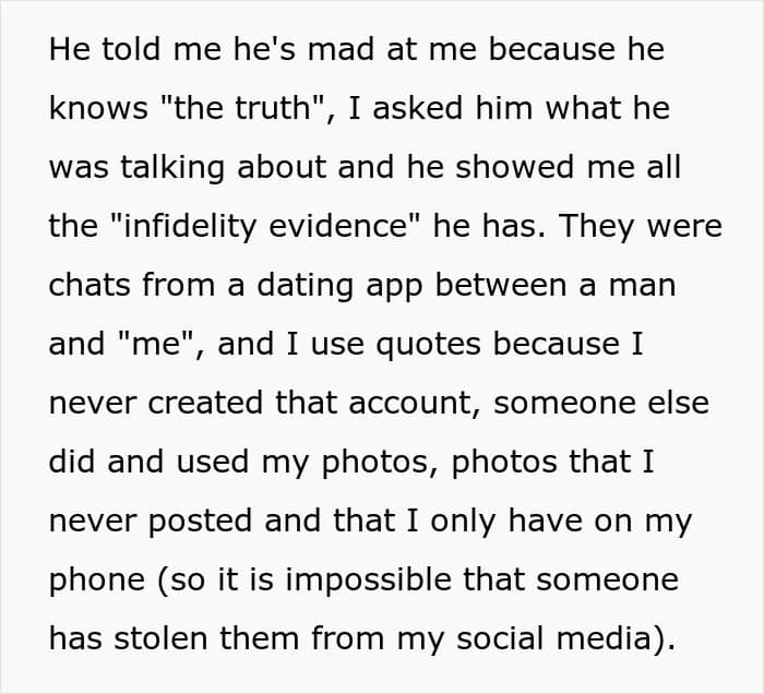 The poster’s husband suddenly started acting weird around her, and later accused her of cheating as he had screenshots of “her” chats from a dating app