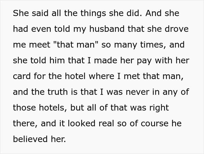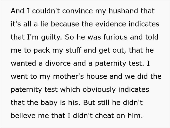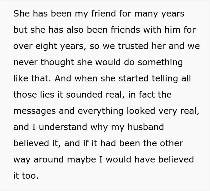 The problem is that the pregnant OP’s husband truly believed that she was having an affair, and he was also concerned that the baby wasn’t his. It probably didn’t help at all that the poster’s best friend was doing everything in her power to make him believe her web of lies.