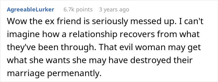 The woman felt glad that she and her husband were trying to repair their relationship, and was shocked at the extreme lengths her ex-bestie had gone to
