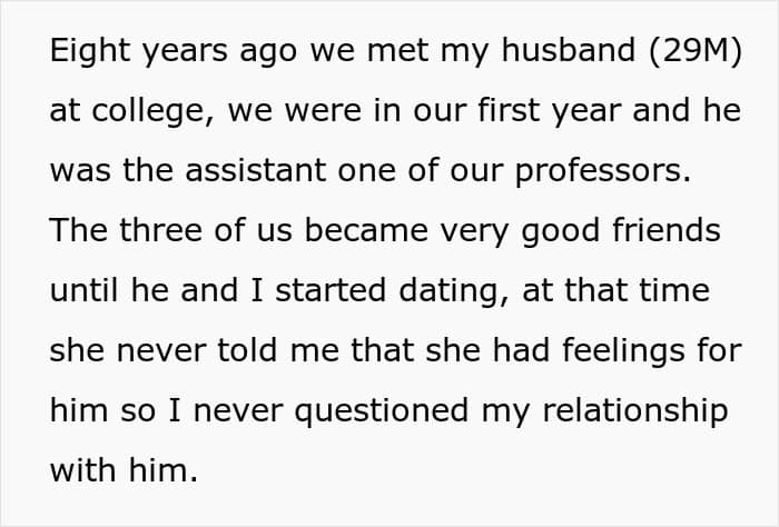 The poster shared that she had been besties with a woman for a decade, and that during that time, she also met her husband, and the three of them became close