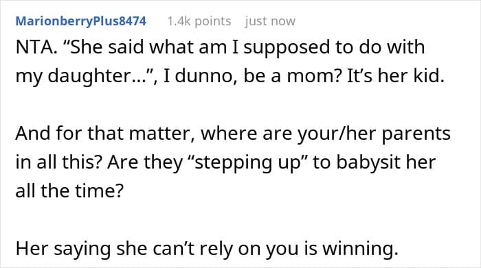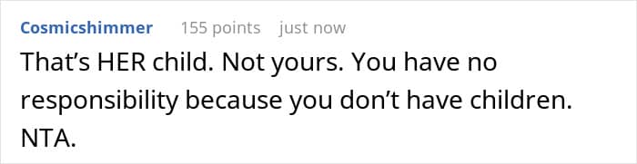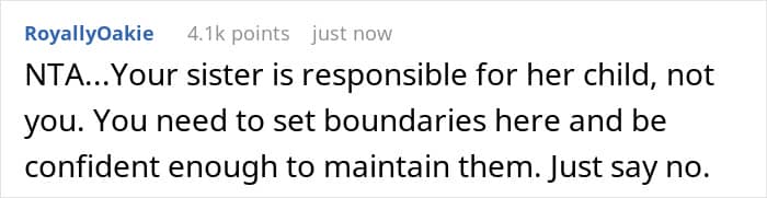 In this case, the whole family is chiming in to ignore her personal boundaries but they are also ignoring the economic reality that her time and financial independence are crucial for her own future. Her refusal started with not liking kids, but it became a necessary decision to protect her own mental well-being and lifestyle. You go, girl!