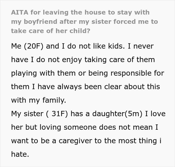 A 20-year-old who doesn’t like kids was guilt-tripped into babysitting for her sister