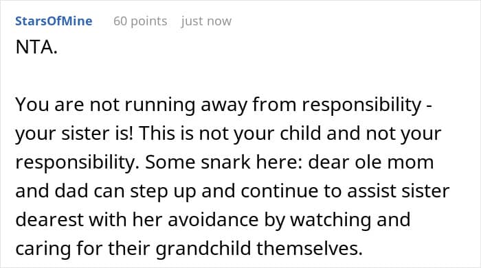 Her family is now furious, accusing her of “running away from responsibility” and “betraying” her sister. But in a glorious update, she reveals that she did go on her trip, and her sister is now giving her the silent treatment, a development she is “so happy about.” In a final, vindicating twist, she notes that in her absence, her sister has finally started to care for her own child.