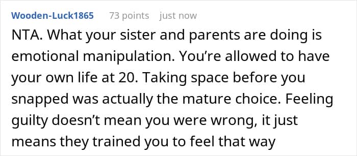 When the OP announced her pre-paid, long-awaited trip with her friends, all hell broke loose. Her sister exploded with rage and asked, “what am I supposed to do with my daughter then?” The argument detonated, with the sister calling her awful names and her parents siding, as always, with the one who was making the unreasonable demands. Overwhelmed and done, the narrator packed a bag and left.