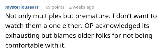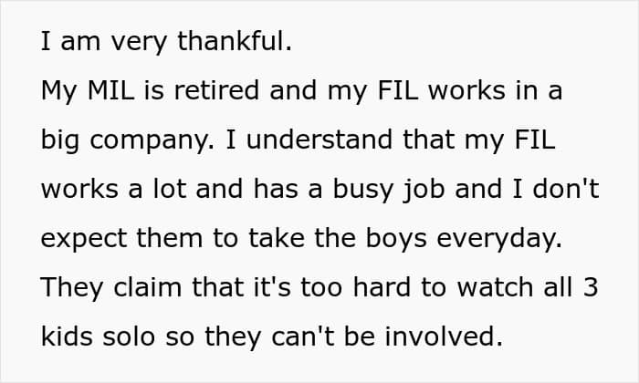The OP did mention to her in-laws that she felt hurt by their absence from the lives of the triplets. They had work and other responsibilities, but she wanted them to be there for the children just like they were for their other grandkid. They made the excuse that caring for three children was too hard, and that’s why they weren’t so involved.