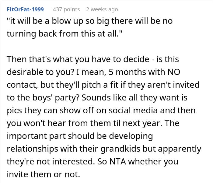 The OP kept giving her in-laws a chance to be involved in the lives of the triplets. Unfortunately, they kept letting the couple down. In the end, the woman decided she didn’t want her in-laws to attend her children’s second birthday party. She knew that doing so would lead to a big fallout, but she was ready to face that.