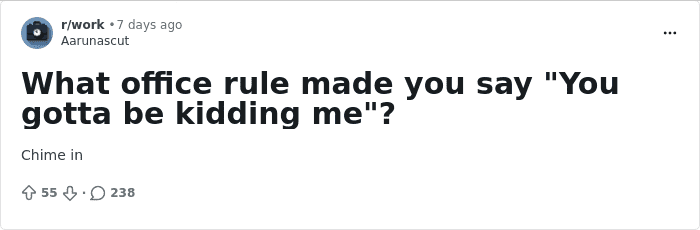 This is the soul-crushing reality of corporate absurdity. An online community asked people to share the most baffling office rule they’ve ever encountered, and the responses are a hilarious and deeply relatable look at what happens when common sense takes a permanent vacation.