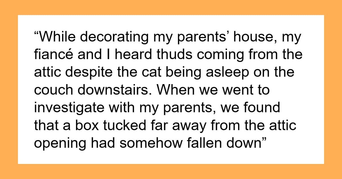My fiancé and I tell my parents we heard something and we were officially creeped out. My mom and fiancé decide to go to the room where the attic entrance is. Low and behold, a box that had been sitting far away from the stairs had fallen down the stairs.