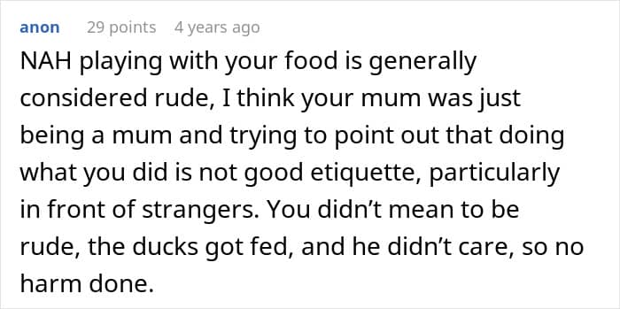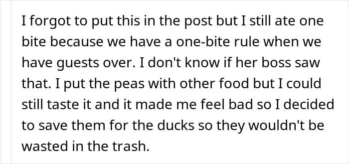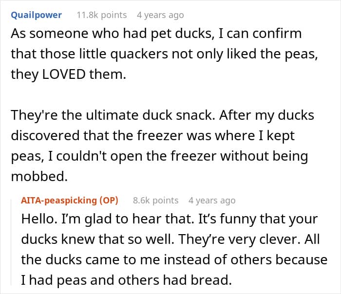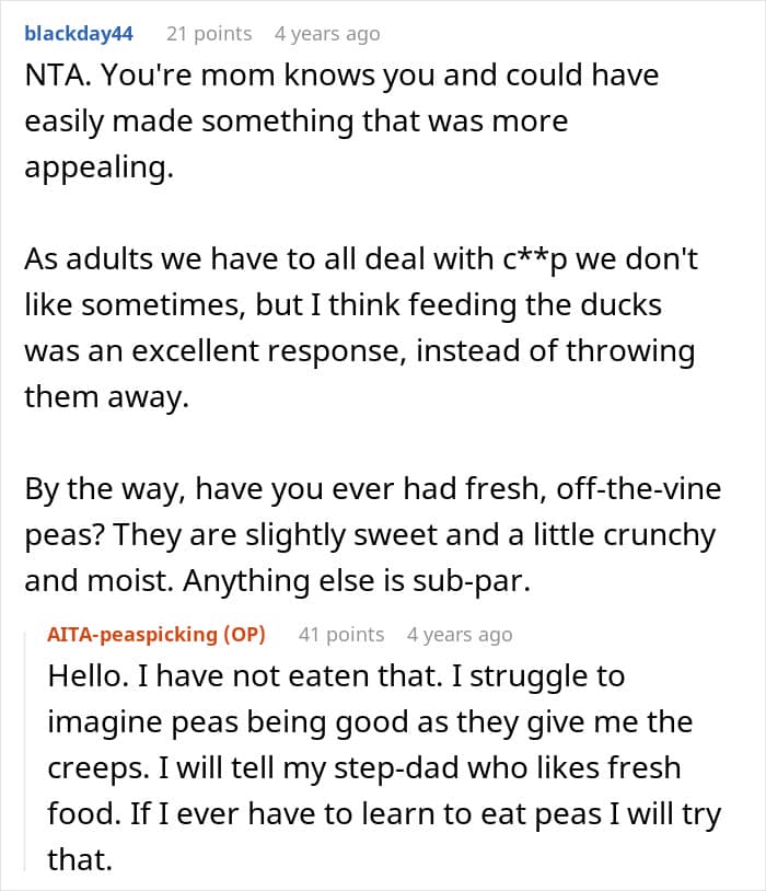So for the author, not eating a food he dislikes felt like the simplest, most logical choice. Why eat something with a texture that feels overwhelmingly unpleasant? And to avoid wasting it, he collected the peas and planned to feed them to ducks. From his perspective, every part of that made perfect sense.