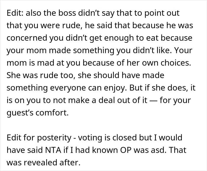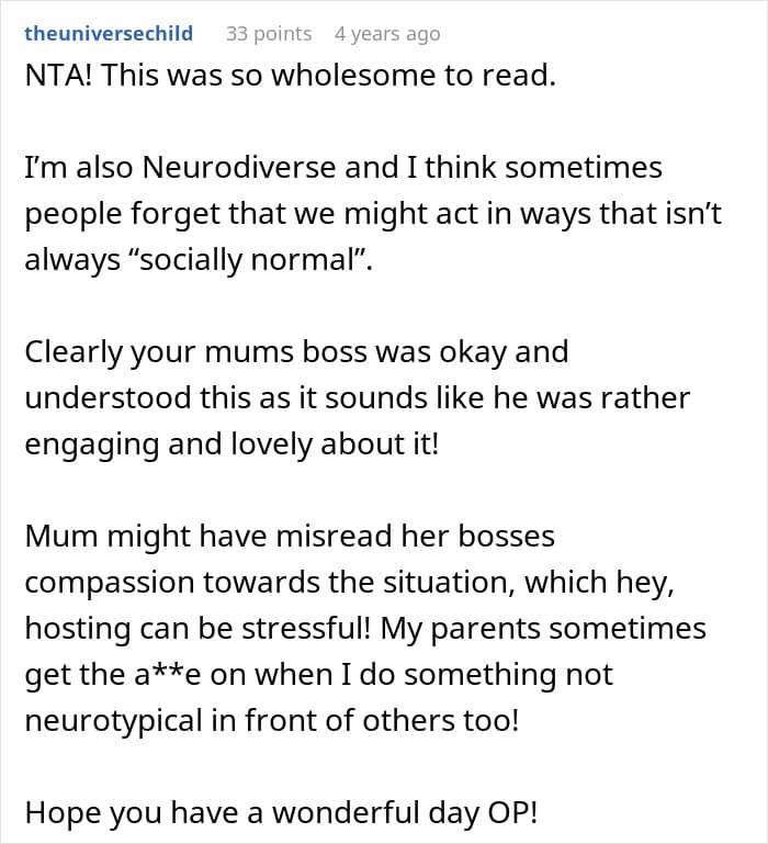 The important thing is that once everything was discussed, the man and his mother understood each other better and resolved the tension. And the warm reaction from her boss is a clear reminder of what happens when people assume good intentions and make space for different communication styles. There’s something everyone can take away from how supportive everyone chose to be.