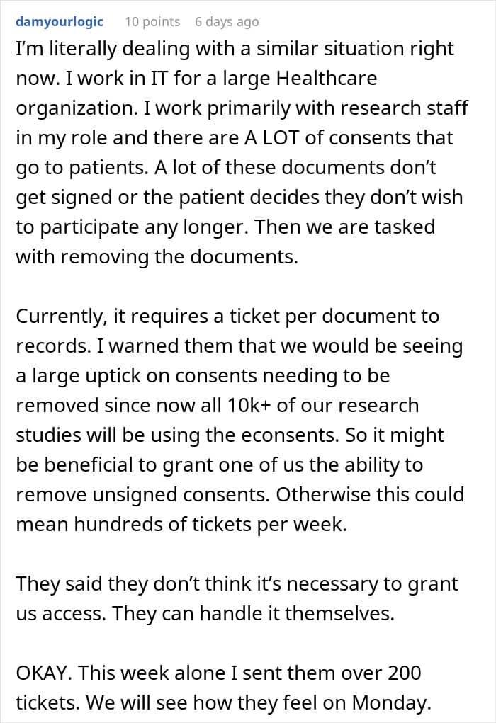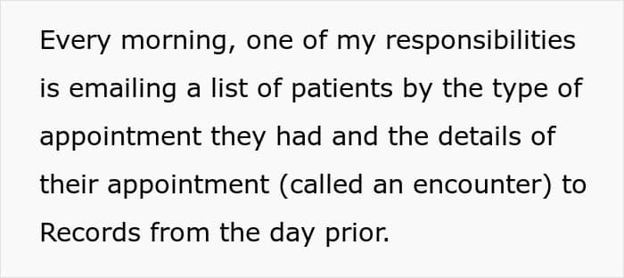 Redditor u/phantommichaelis shared how she taught her passive-aggressive coworker a lesson about courteous communication. The OP explained to the r/MaliciousCompliance community how she’d usually send out internal emails to Records, grouping patient information by type. However, a new employee demanded that she send each appointment individually, rather than all in one tidy email.