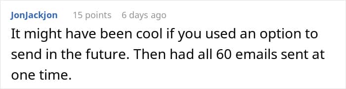 In short, redditor u/phantommichaelis maliciously complied with her rude coworker’s request. She sent 60 emails back to back, instead of sorting everything neatly by type. It took 2 extra hours, but the payoff was pretty quick. After just 2 days of this, the passive-aggressive coworker quickly realized the mistake she made.