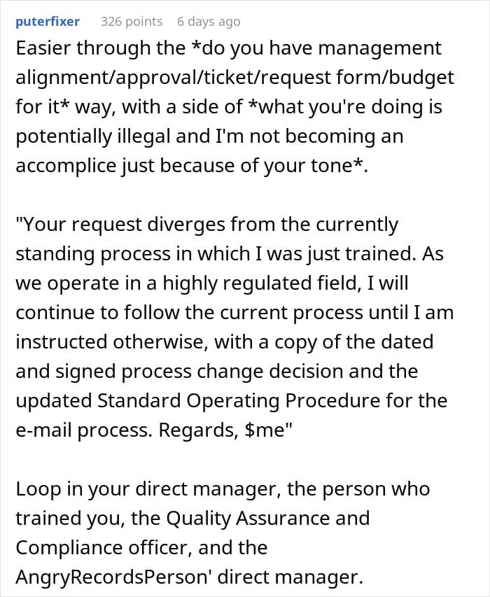 An employee shared how she dealt with someone’s rude request concerning how she sends work emails