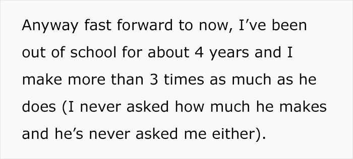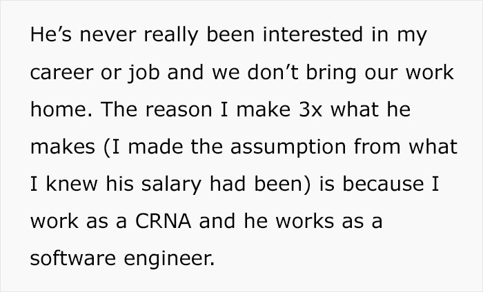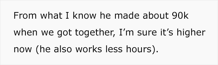 But fast forward to today, the author has been out of school for 4 years and makes more than 3 times as much as her husband, she argues. This didn’t go unnoticed when the husband saw her new big purchase, wondering where she got all that money from.