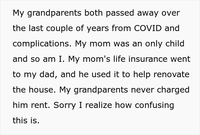 Turns out, the OP’s father never bothered to tell his wife that the house isn’t his, and when he got back from his job, the woman brought the concern up. Apparently, the stepmother wants her to move to the city while she finishes her education. She even offered the OP her apartment at a discount, which is rather odd considering that she’s been living under the OP’s roof for free.