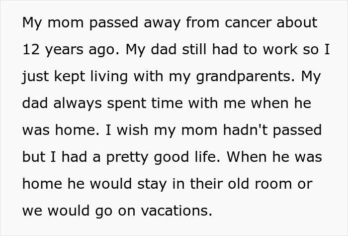Her father started dating a few years after her mom’s passing, and he refrained from bringing anyone to the house until he met her stepmother-to-be. The woman has two children from her previous relationship, and when things got serious, the OP’s dad wondered whether it’d be OK for them to move in.