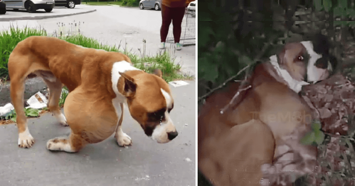 The dog is an amstaff breed. He can only stand because he is immovable. What happened to him is unknown. He might have been shot earlier because he was in a wooded location.