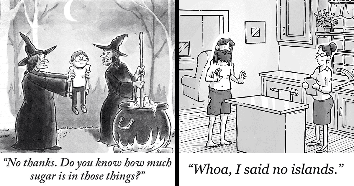 After I graduated, life got busy with a full-time job and two kids, and my cartooning slowed way down. I was coloring all my cartoons, and my process was really slow and laborious. For a while I was only producing about one new cartoon a month. My motivation had tanked, and I wasn’t having as much fun. Then I had some family members gift me some books by New Yorker cartoonists. I got a collection by Peter Arno, a collection by Charles Addams, and the (big red) Complete Collection of New Yorker Cartoons. The New Yorker style of cartoons really intrigued me with the loose lines and the gray ink washes. I started to experiment with a new style, and soon had drastically cut down the time it took me to complete a cartoon, and I liked the results a lot more. I had gotten my motivation back. I’ll still use color sometimes, but I really love the gray wash look.
