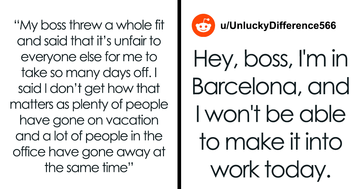 Other than that, some pointed out that the boss is jealous of OP’s trip and is deserving of other inevitable scenarios, like taking 5 days off and calling in sick for the remaining 2, or when the time comes for the remaining 2 to happen, just to call in and say “Hey, I’m in [insert very distant European city here], I won’t be able to make it to work today” because ridiculous excuses call for ridiculous measures.