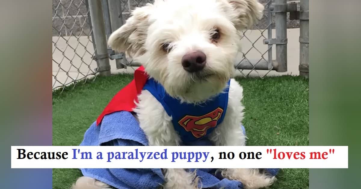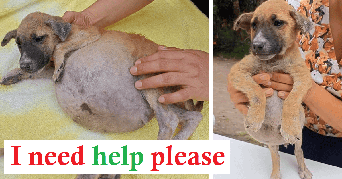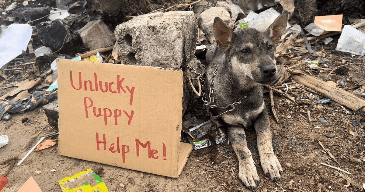 Abandoned puppy with the words: "Unlucky Puppy – Help Me!"